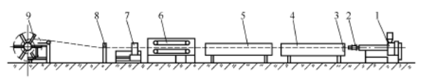 Jak je vidět z obrázku 1, zařízení pro vytlačování trubek po proudu sestává hlavně z nádrže na chladicí vodu,odtahová jednotka, řezačka, navíječnebo výpis tabulky.