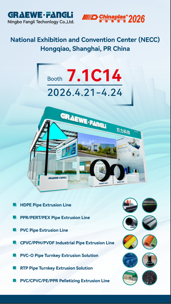 मराठी Vítejte v našem stánku 7.1C14 na ChinaPlas 2026,Ningbo Fangli Technology Co., Ltd.(dále jen "Fangli") se specializuje na výzkum a vývoj, výrobu a prodejzařízení na vytlačování plastů, nové výrobní linky na ochranu životního prostředí, stroje na svařování plastových trubek a pomocné stroje na plasty.